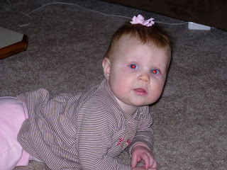 On the one Friday a month that Andy has to work, Ry gets to spend the day with her Auntie Julia. Since she is becoming more mobile and eating food and such, Julia came to spend the day out at our house this last time…meaning Auntie Julia had free reign over Rylee’s closet! I came home and these were on my camera! Auntie Julia found Rylee’s hair bows! Even though they’re pink, Rylee looks really cute!
