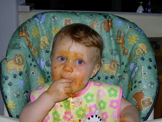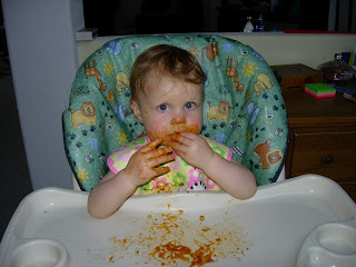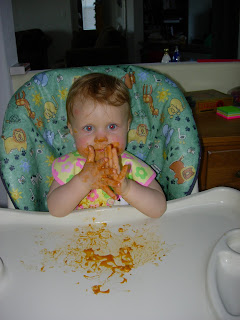 It was just Rylee and Mama for the evening…and it was bath night…so baby Spaghetti-o’s was on the menu for dinner! Rylee wouldn’t let me feed them to her with a spoon, she kept taking them out of her mouth, looking at them, then eating them. So, I decided to go ahead and put them on her tray. She was a MESS! It was hilarious.