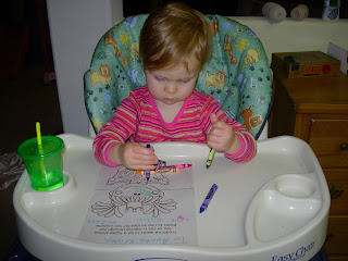 Rylee has been in daycare 2 days a week for the last 2 months. She is really starting to enjoy it! Every month, they make an art project. In September, it was apple trees made out of Rylee’s hands, October was a “haunted house” with a ghost in the doorway made of Rylee’s footprint. I can’t wait to see what November’s artwork is! Another thing they do is color pictures. So, we have started doing that at home too. She is still working on getting the hang of crayon on paper, but she enjoys playing with the crayons and does a little scribble here and there. Putting her in her high chair with some crayons is a great way for me to get dinner made without interruption!