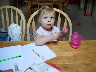 Way to work on those fine motor skills young! Coming from the mouth of a teacher… of course! We used to get kinders who had never used a pencil before! Her day care sounds neat. Where does she go the other day? I'm trying to figure out what to do for next year… hmm.gaby