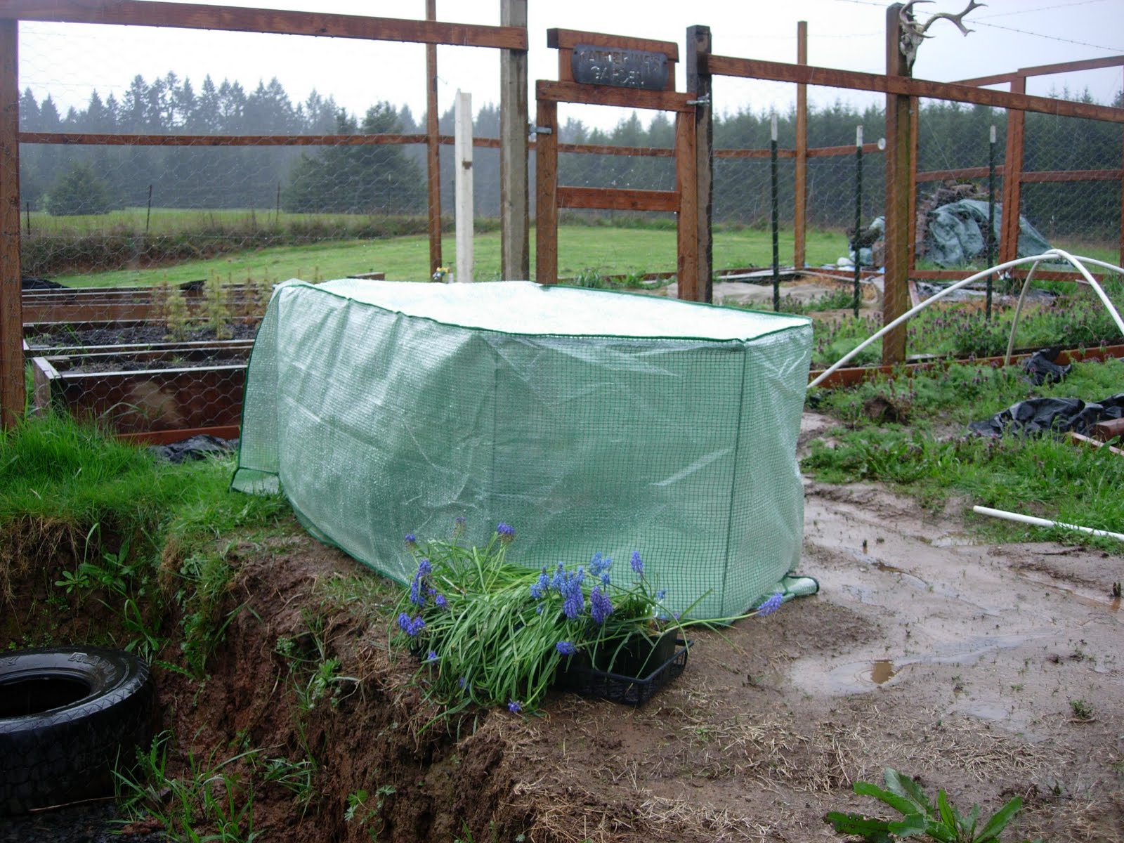 It has been pouring all day here…at least I think so, I don’t look out my office window very often. On my way home from work the wind was gusting like crazy. I could feel my car being pushed toward the center line. Anyway, when I got home, I opened up the garage to get the BBQ out (yes, we had shish-kabobs on a day like today–hello!, we’re from Oregon!). My super awesome sis had brought down some grape hyacinths from her yard for me to plant and they were still in the garage so I decided to go put them out in the garden…at least they’d get watered with all the rain! What did I happen to see? This…
