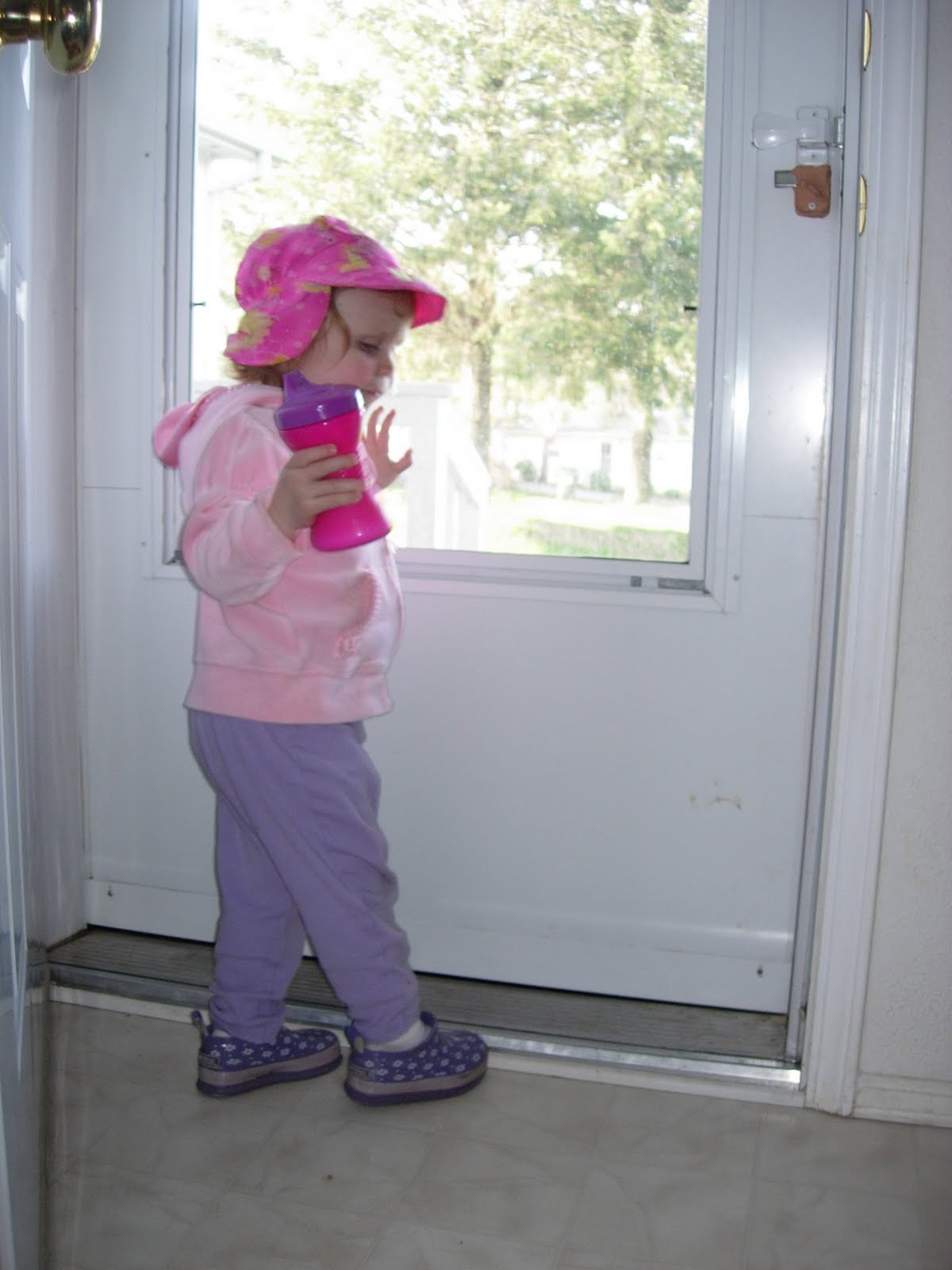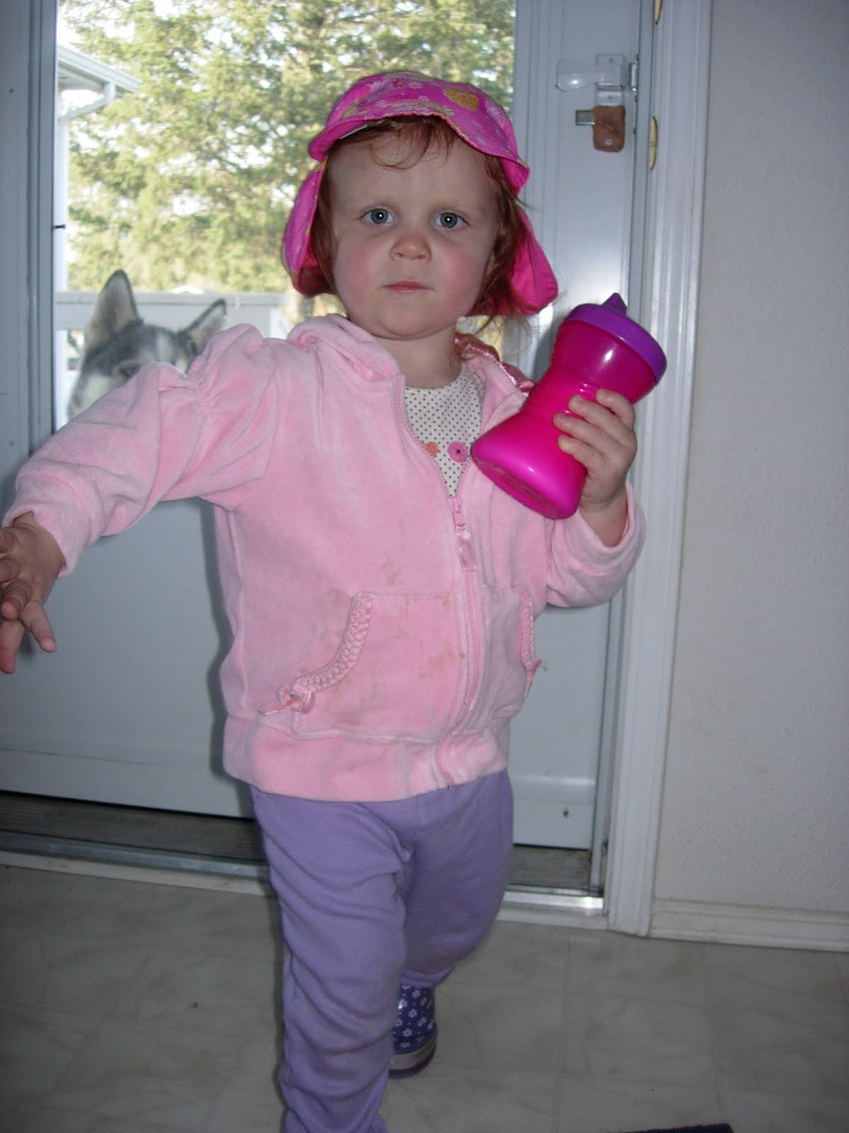 Outfit Recap (head to toe): Bright Pink Summer Safari hat with yellow flowers, baby pink velour front-zip hoodie, purple pants and her purple short-boots with white flowers. At least she is accessorizing correctly with her pink and purple sippy cup.