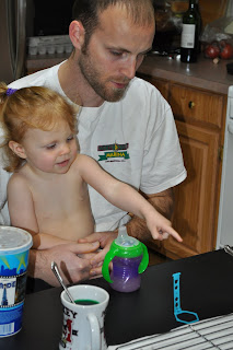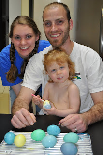 We only colored 8 eggs and 4 different colors, made a HUGE mess and had a great time! Rylee was totally into coloring the eggs, it was very cute. Auntie Kristen took some video and if I can get our freakin’ Internet to cooperate, I will upload it. Until then…the super-cute pics. Aside from the goofy tail-braids I was wearing (I had a cute military hat on earlier), I think this it my favorite family photo!