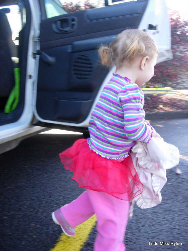 Rylee decided for her “two” birthday that she wanted to wear her tu-tu. She was a moving target, but you still get the jist. Pink tennies, pink sweats, a purple, pink and blue shirt aaaannndd…the red tu-tu. According to daycare, she even kept her hair in for most of the day!