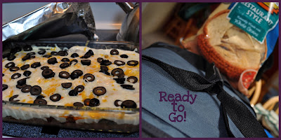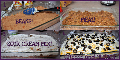 Brown ground beef, and prepare as instructed on taco seasoning packet. While the meat is cooking, spread beans in the bottom of a 9×13 pan. In a medium bowl, mix together sour cream and taco sauce. Once meat is ready, spread evenly over the top of the beans. After that, spread the sour cream mix. Then top GENEROUSLY with cheese. Seriously…error on the side of A LOT. Sprinkle with sliced olives. Cover with aluminum foil (remember to spray the foil w/ non-stick spray!). Bake at 350 for 20 minutes.