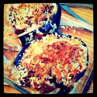 Spoon the mixture into your eggplant shells. In a separate bowl, combine Panko, olive oil and remaining cheese. Top stuffed eggplants with panko/cheese mix. Bake for about 10 minutes or until golden brown and heated through.