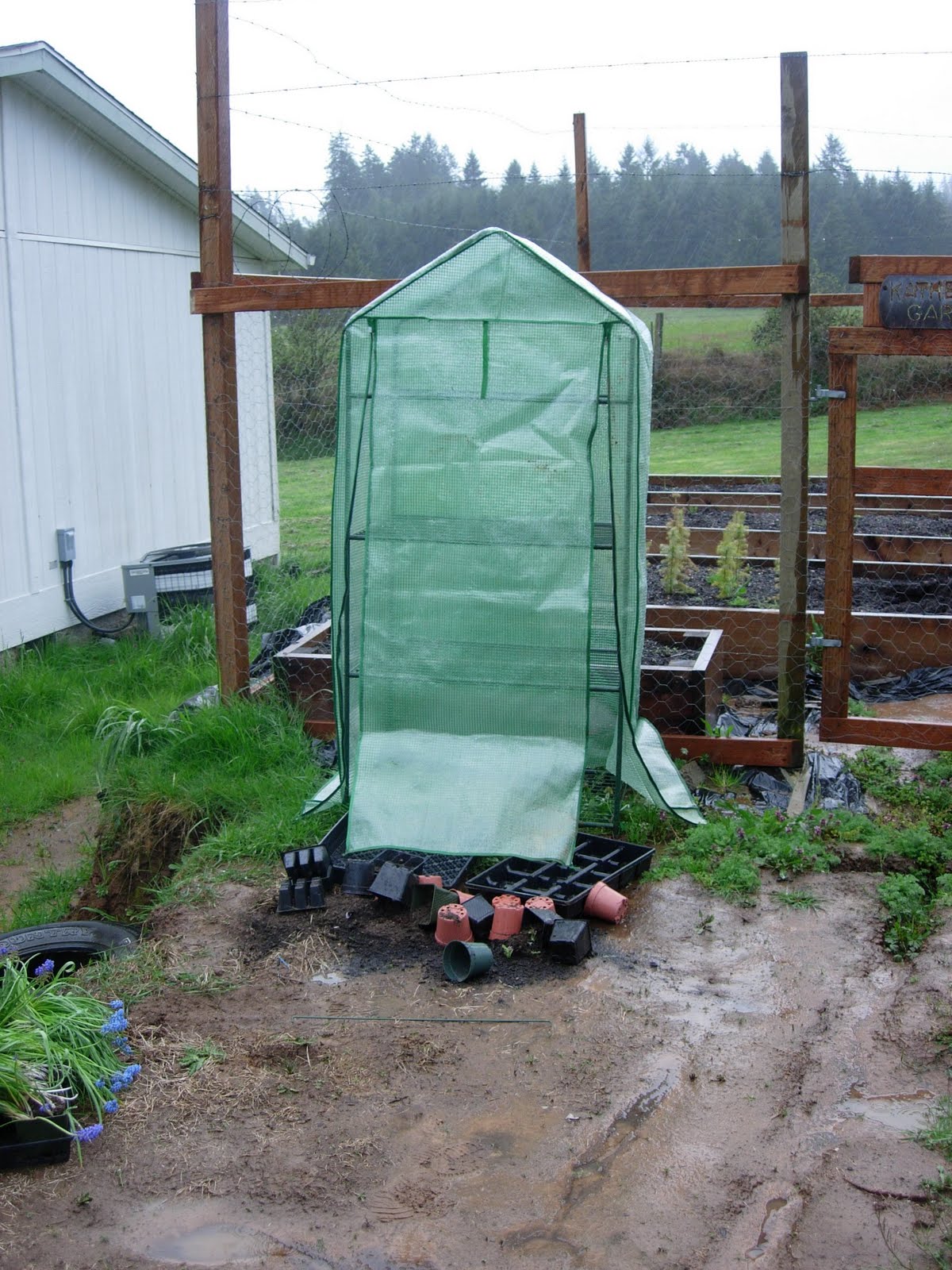 It has been pouring all day here…at least I think so, I don’t look out my office window very often. On my way home from work the wind was gusting like crazy. I could feel my car being pushed toward the center line. Anyway, when I got home, I opened up the garage to get the BBQ out (yes, we had shish-kabobs on a day like today–hello!, we’re from Oregon!). My super awesome sis had brought down some grape hyacinths from her yard for me to plant and they were still in the garage so I decided to go put them out in the garden…at least they’d get watered with all the rain! What did I happen to see? This…