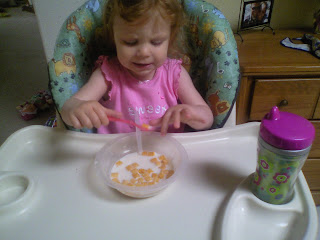 Rylee was in a seemingly good mood this morning…things started off just fine in fact. Then breakfast time rolled around. She decided she couldn’t decided between an orange or a pear and we stood there with the refrigerater door open for nearly a minute before I smartened up and realized I should just move her out of the way and close the door while she decided. Finally, the decision was an orange. Then she wanted some cereal to go with it. No big deal. I opened up the cereal cupboard and she chose Chex. Great choice. So while I was peeling the orange (which I am HORRIBLE at, by the way), she sat at the table in her chair with some cereal in front of her.  Next thing I hear is the sound of cereal dumping all over the table! Awesome. She got to the box, pulled out the bag and dumped it out because she wanted more. She then preceeded to “accidentally” push some into her lap and squish and crunch it under her bum. Even better. I managed to get it dumped into a bowl and the crumbs all cleaned up. She ate her orange and all was well…or so I thought.