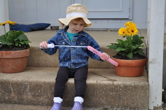Saturday morning, Ry was up at a bright and early 6:45 am. We spent the morning watching cartoons and eating breakfast. By 9:30 Ry and I his the road. We had lots of errands to run– Gas station, Target, Costco, Grandad’s house, Winco and 4 hours later, finally back home. Ry fell asleep on the way home and proceeded to sleep for nearly 3 1/2 hours! I used that time to do all kinds of productive things like…eat lunch, check my e-mail and facebook and start 1 load of laundry. After she woke up we played outside before coming in for dinner and wrapping up the day with a bubble bath. Oh, how can I forget!? While at Target we bought some Dora the Explorer undies and she wore them for a couple of hours after her nap. We set the timer for 20 minutes and when the timer went off we ran to the bathroom to sit on the toilet. She never actually peed in the toilet. Oh no…she waited until she was standing on a chair in the kitchen helping me cook dinner. Oh well, at least she was on the linoleum, right?