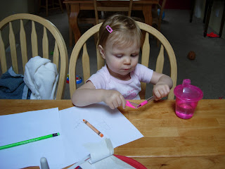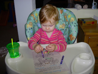 Rylee has been in daycare 2 days a week for the last 2 months. She is really starting to enjoy it! Every month, they make an art project. In September, it was apple trees made out of Rylee’s hands, October was a “haunted house” with a ghost in the doorway made of Rylee’s footprint. I can’t wait to see what November’s artwork is! Another thing they do is color pictures. So, we have started doing that at home too. She is still working on getting the hang of crayon on paper, but she enjoys playing with the crayons and does a little scribble here and there. Putting her in her high chair with some crayons is a great way for me to get dinner made without interruption!